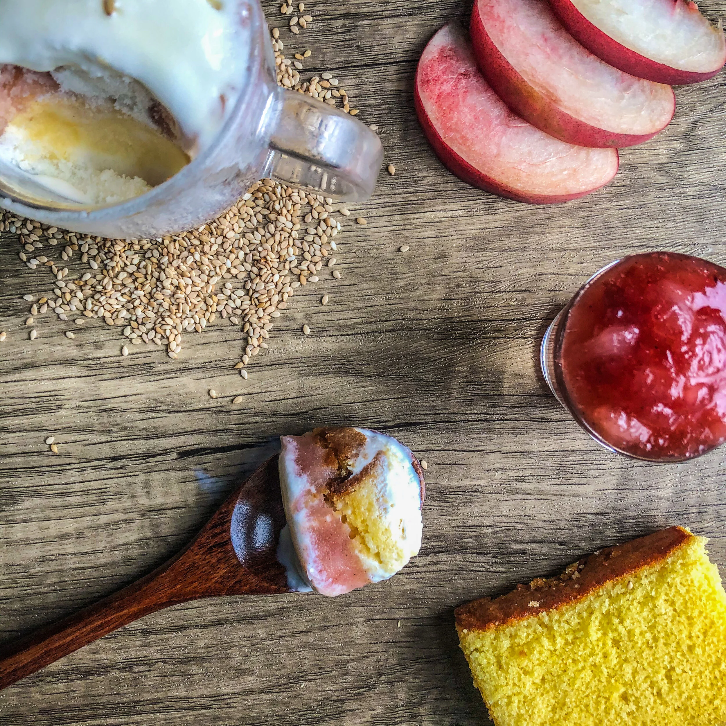 Then, the coulis is to be blended, a handheld blender is fine as well and blend until smooth. Now that we have all our layers ready we can start to build ! The first layer is going to be a thin layer of Golden Sesame ice cream, add that carefully by spoon. Next is our cake, for ease you can cut the cake into small squares and arrange a layer of cake . Then, crack open the can of Mango Makku and spoon just enough over to moisten our sponge( if you are wondering what to do with the rest of the Makku, bottoms up !). Layer a spoonful of coulis and then the buttered peach, you can decorate it in a festive manner, the final layer before we begin again will be Golden Sesame ice cream. Keep this pattern going until you reach the top( see pro tip₂). That is all, it is super simple and sweet. Why don’t you enjoy what is left of summer with this one, it will take you where the summer never ends.